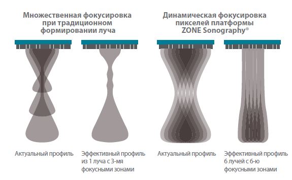 За счет передачи и получения сигнала от сравнительно небольшого количества крупных зон при получении усовершенствованных акустических изображений извлекается больше информации для каждого кадра и построение изображения происходит в 10 раз быстрее, чем при традиционном построчном способе формирования ультразвукового луча.